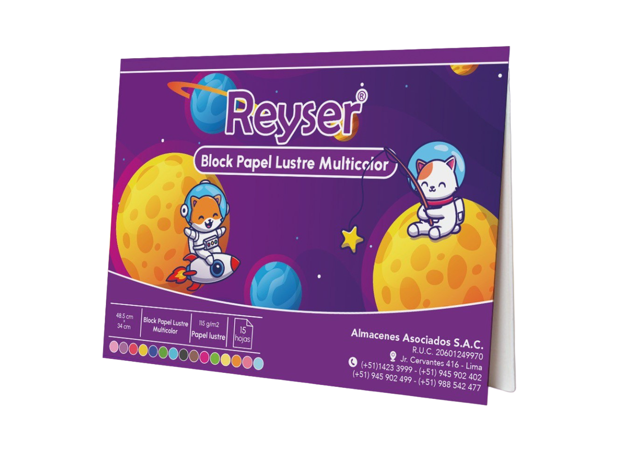 BLOCK : T/PAPEL LUSTRE D/PAPEL BOND TAM: 48.50 X 34.00 cm CONT: 15 HOJAS G: 115 gr COL: COLORES VARIOS G.F: 12 MESES UNIDAD REYSER R100425